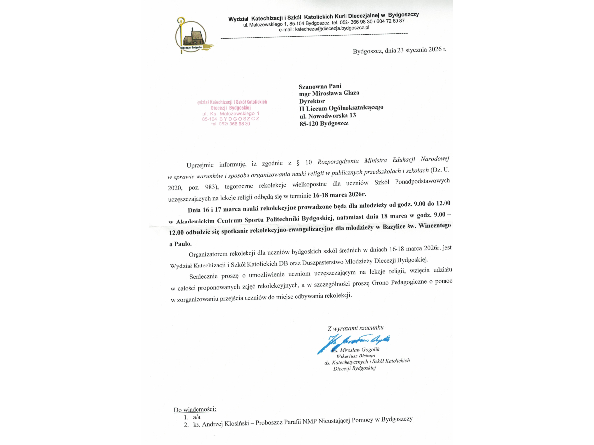 Rekolekcje wielkopostne dla uczniów szkół ponadpodstawowych miasta Bydgoszczy, odbędą się w dniach 16-18 marca 2026r.